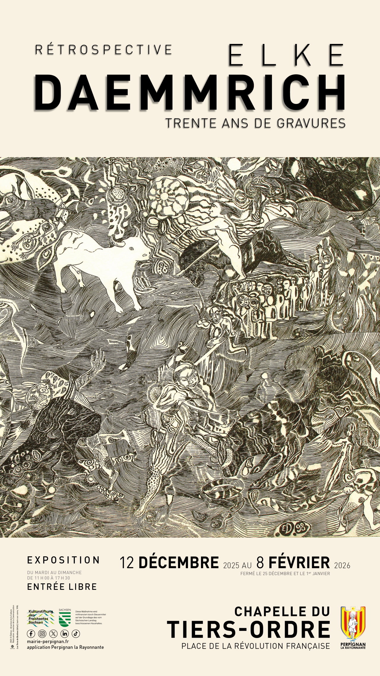 La direction de la Culture de la Ville de Perpignan a le plaisir de présenter l’exposition Rétrospective Elke Daemmrich : trente ans de gravures. Cette artiste peintre et graveur, originaire de Dresde (Allemagne), s’est imposée sur la scène artistique internationale par la force de son trait et la richesse symbolique de ses compositions. Son oeuvre gravée développe, dans un foisonnement de détails, la fragilité de la nature humaine et la beauté inquiétante d’une nature sauvage toute puissante. Pour y parvenir, Elke Daemmrich interroge l’Histoire, passée ou récente, la littérature, l’art ou la mythologie. Elle nous livre une vision dantesque d’un monde en perpétuel déséquilibre soumis aux contradictions de la psyché humaine.