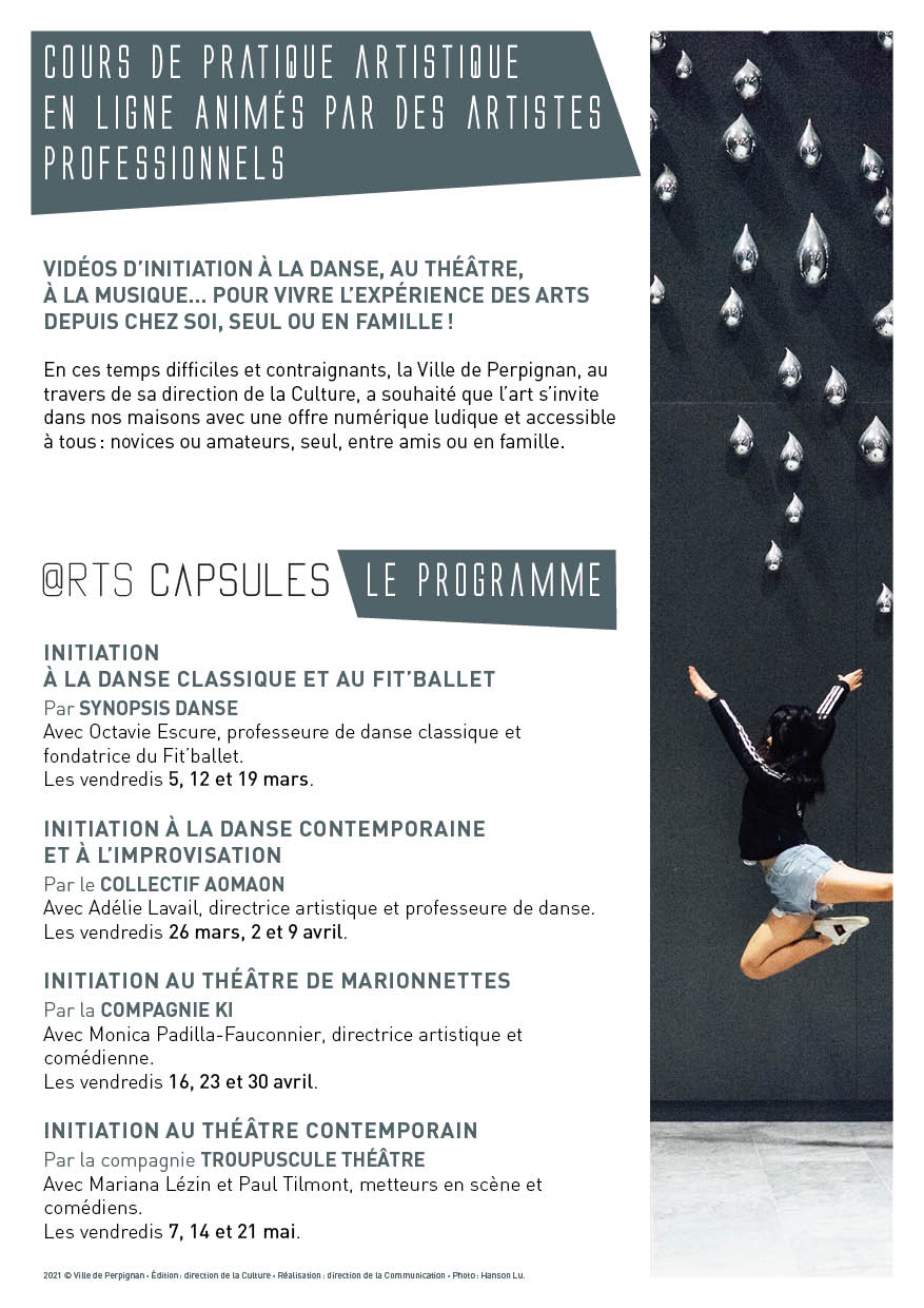 Tous les artistes-enseignants intervenant dans les @RTS-CAPSULE œuvrent à Perpignan et se mobilisent pour proposer des cours express de pratique culturelle, une fois par semaine, sur le Facebook de la Ville et sa chaine YouTube, jusqu’au 21 mai 2021.