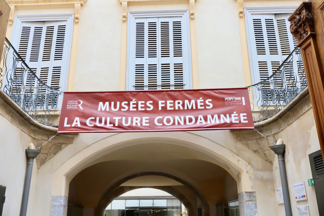 Le message « Musées fermés, la culture condamnée » arbore les 2 entrées du musée Hyacinthe Rigaud. Un symbole fort qui traduit le regret de la municipalité à refermer ses structures culturelles.