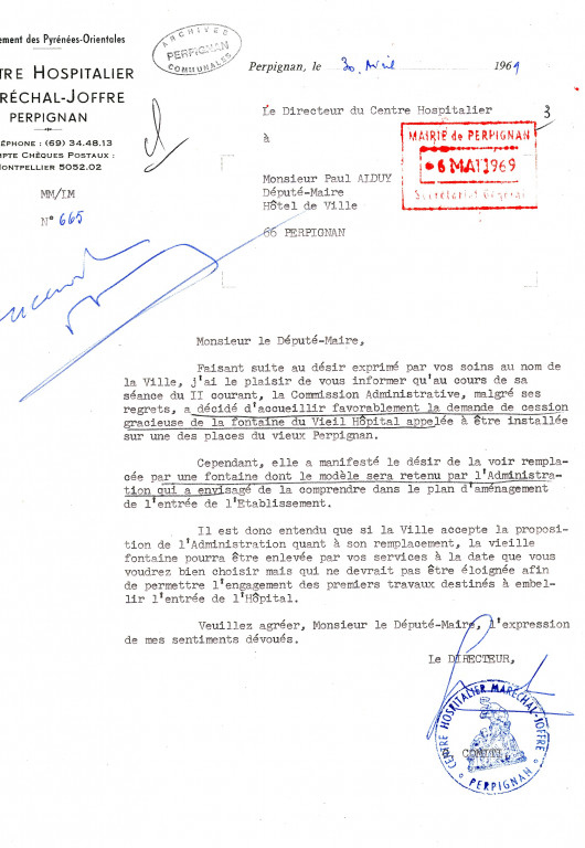 En 1969, alors qu’elle se trouvait dans l’entrée de l’hôpital du Haut-Vernet qui allait être agrandi, la commission des hospices la cède à la Ville de Perpignan. Elle est alors installée Place Gambetta. Vestige du vieil hôpital disparu, elle en rappelle toujours, tout près, sa mémoire. La plaque de sa fondation a été apposée sur le mur d’en face, 7 place Gambetta.