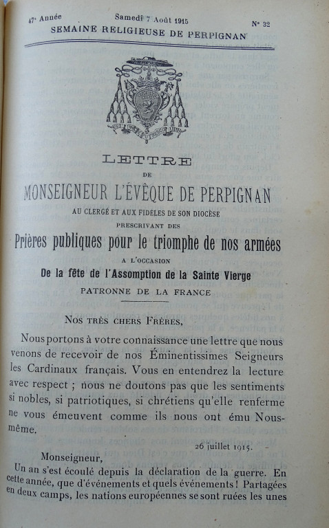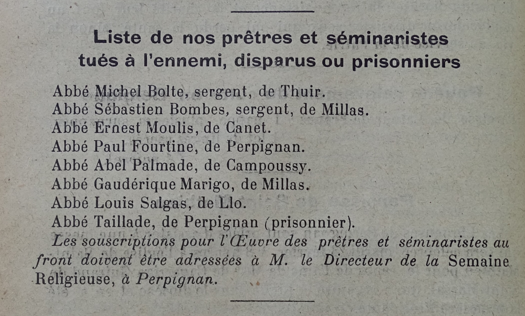 D’après Francis Waffelaert : « Mgr de Carsalade du pont et le clergé roussillonnais », Perpignan pendant la première Guerre mondiale,