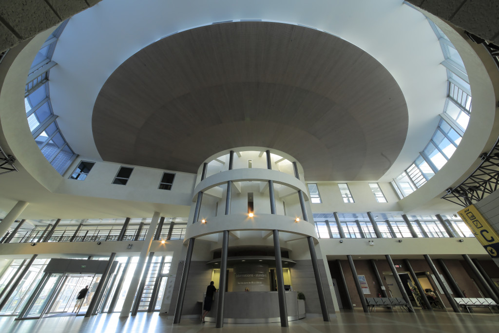 Cette architecture singulière, mêlant le bêton brut, l’acier des supports métalliques, le verre, la résine de bêton coloré en rouge ou simplement la brique, joue avec subtilité de l’ombre et de la lumière, à travers les façades audacieuses mais aussi les touches végétales ponctuelles et intenses des puits de lumières.
