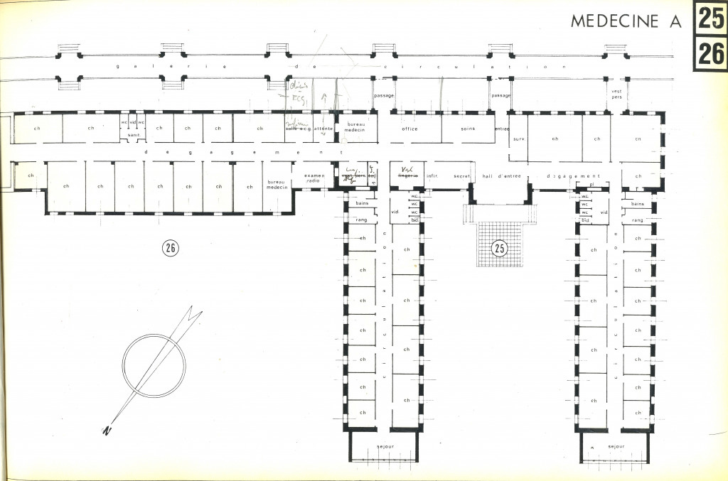Dès la fin du XIXe siècle, mais surtout après la guerre de 1914-1918, les architectes abandonnèrent les bâtiments monoblocs avec des cours intérieures pour développer le système des pavillons isolés avec de vastes espaces verts. Les constructions isolées étaient parfois reliées les unes aux autres par des galeries couvertes. Cette disposition, spécifiquement française, était l’œuvre de Ténon et Lavoisier.