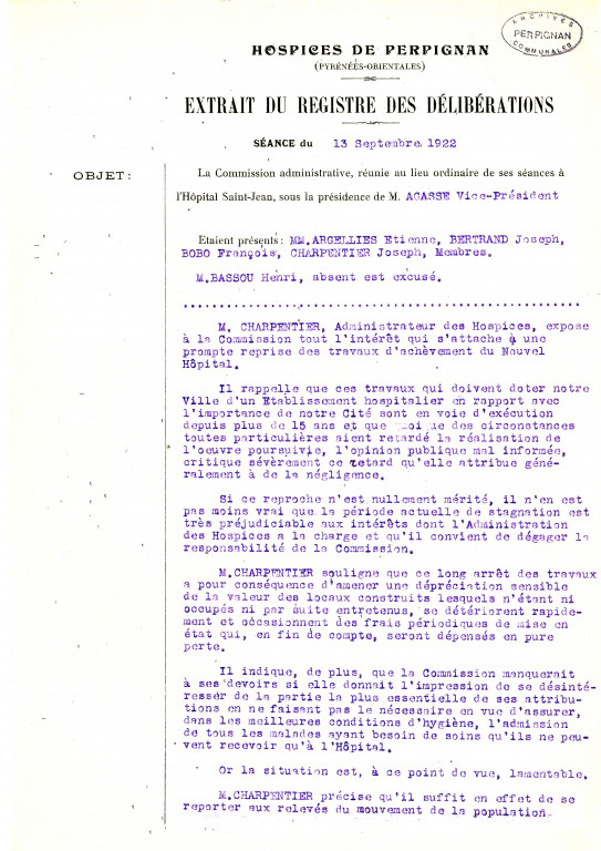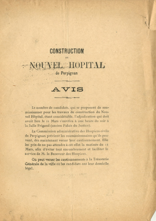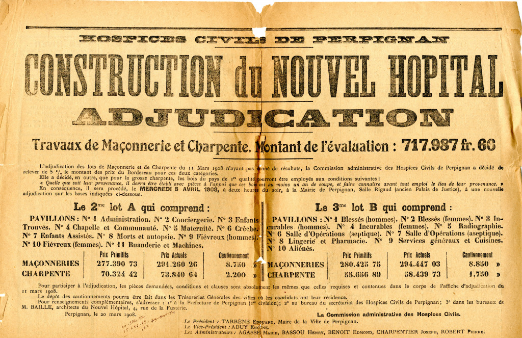 Le projet de la construction d’un nouvel hôpital répondant à toutes les règles d’hygiène, naquit en 1904, en même temps que démarrait la démolition des remparts-nord, qui allait ouvrir la vieille ville vers la gare, Canet, et… le Vernet. Le 7 décembre 1904, sur la proposition des docteurs Charpentier, Benoit et Brousse, il fut décidé de construire le nouvel hôpital « hors de la ville » : « Une ville nouvelle va être créée, cet hôpital y trouvera sa place ».