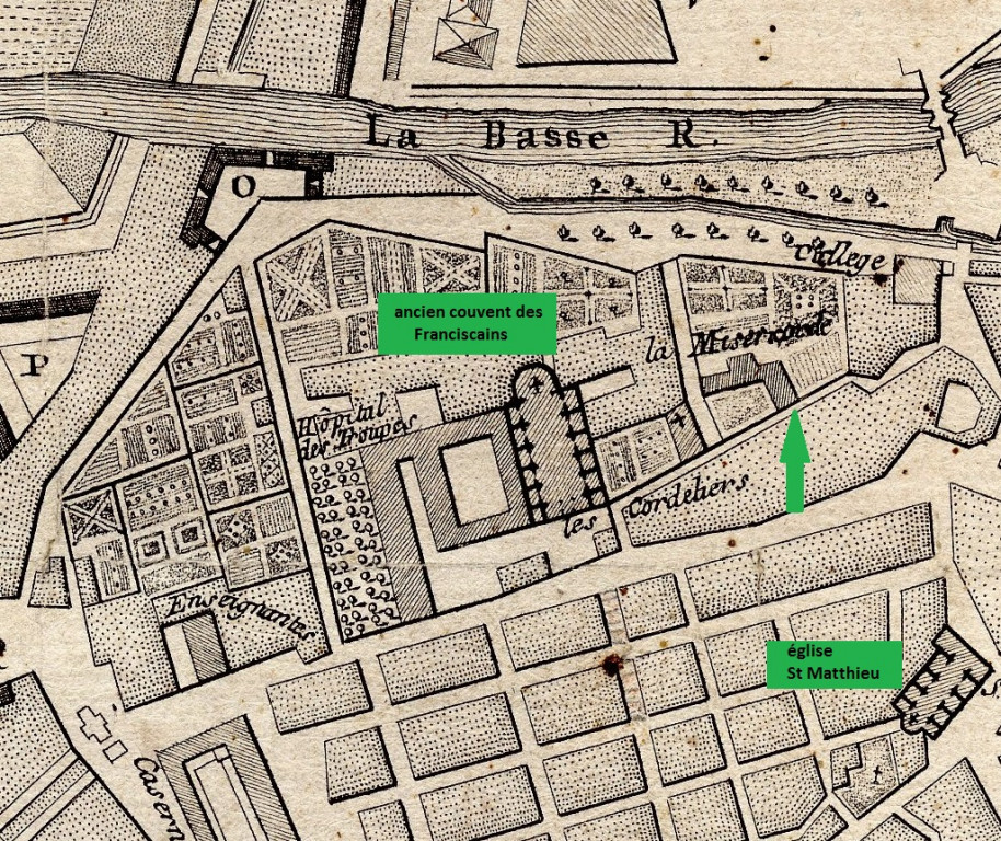 La Miséricorde était située à l’origine « carrer de la trilla », actuelle rue Abaddie, toute proche du couvent des Franciscains.