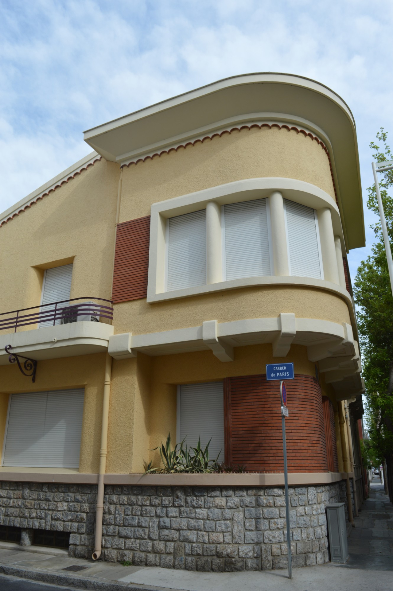 Style Art déco de type paquebot, qui rappelle l’architecture d’Alfred Joffre et Férid Muchir : Fenêtres géminées, balcon arrondi, brique et béton.