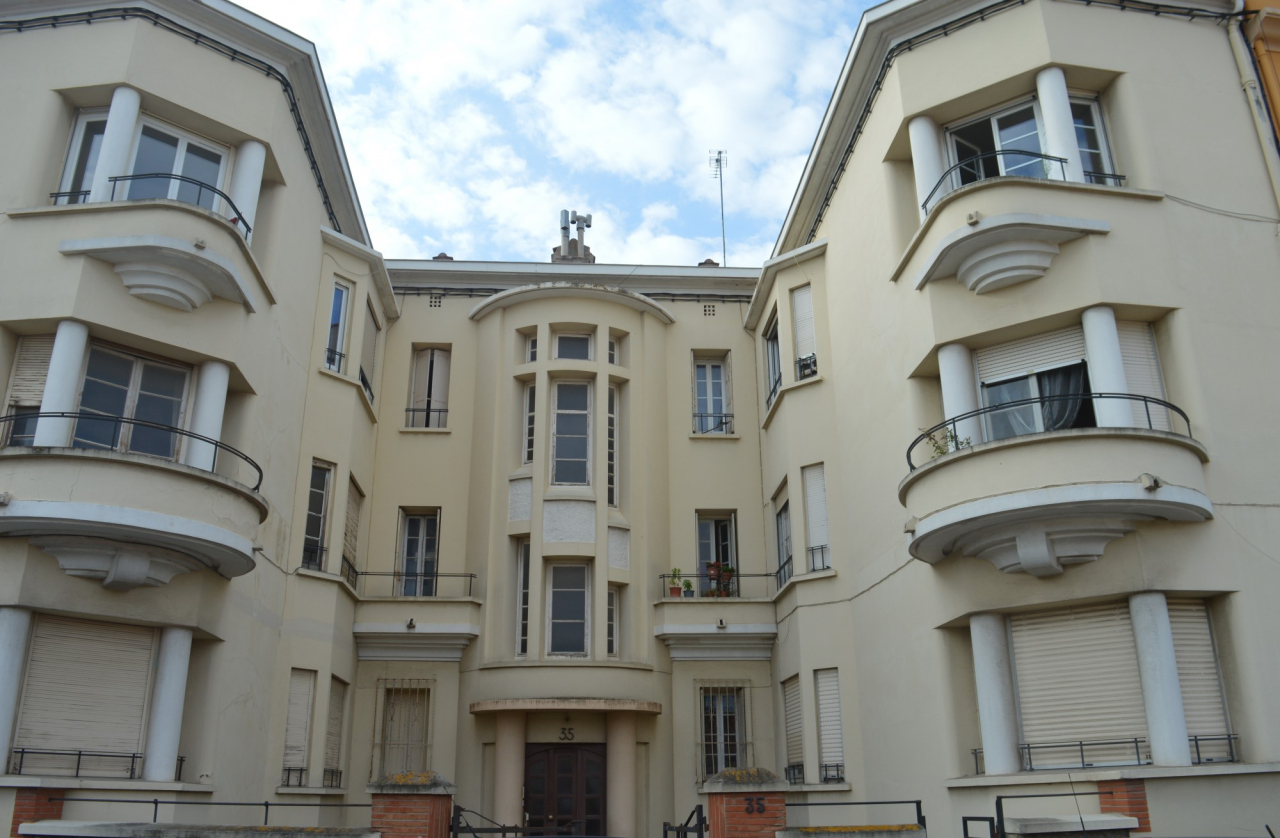 Description : Édifice de style Art déco avec une composition géométrique et symétrique ainsi que des balcons latéraux arrondis.