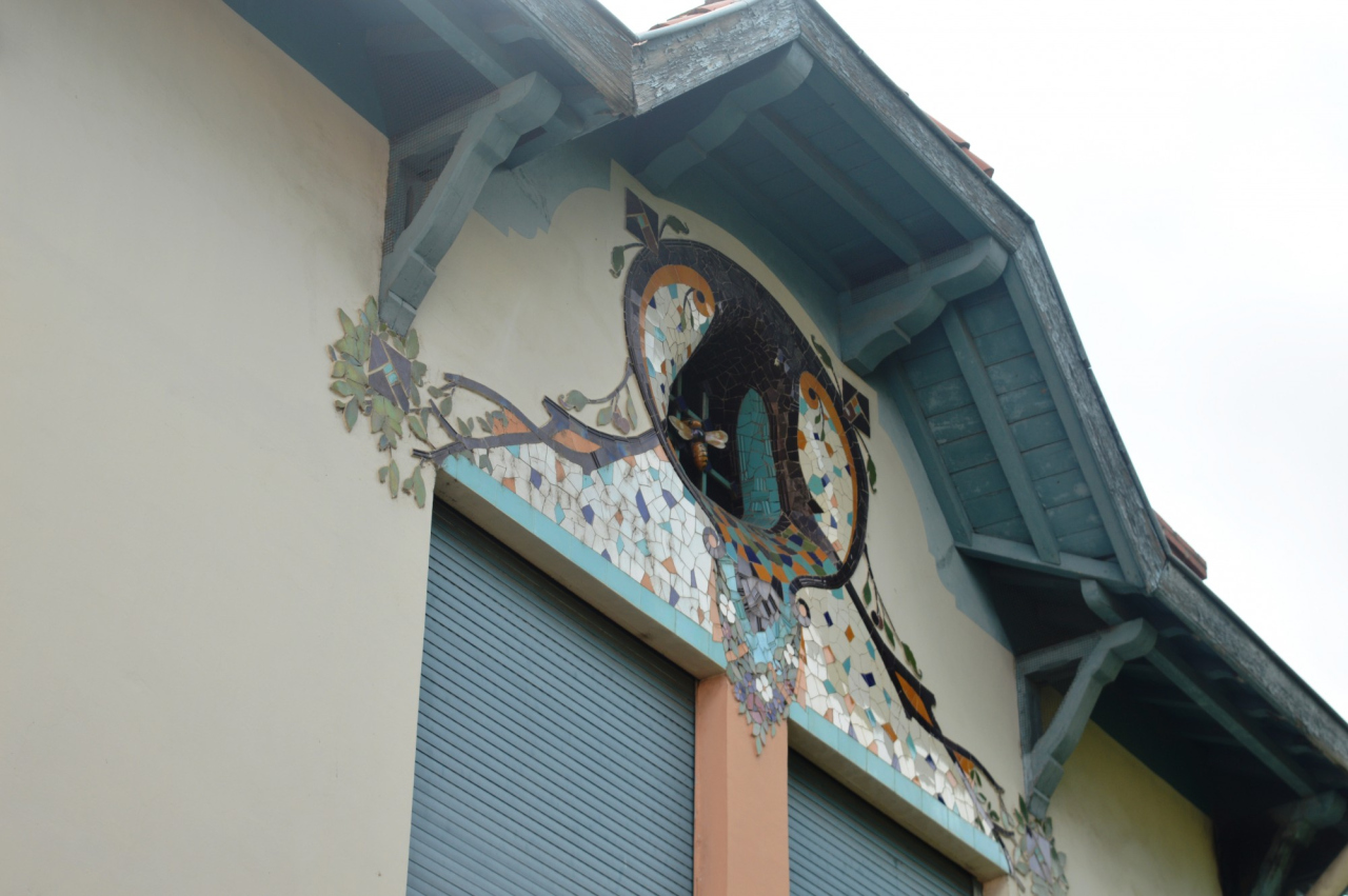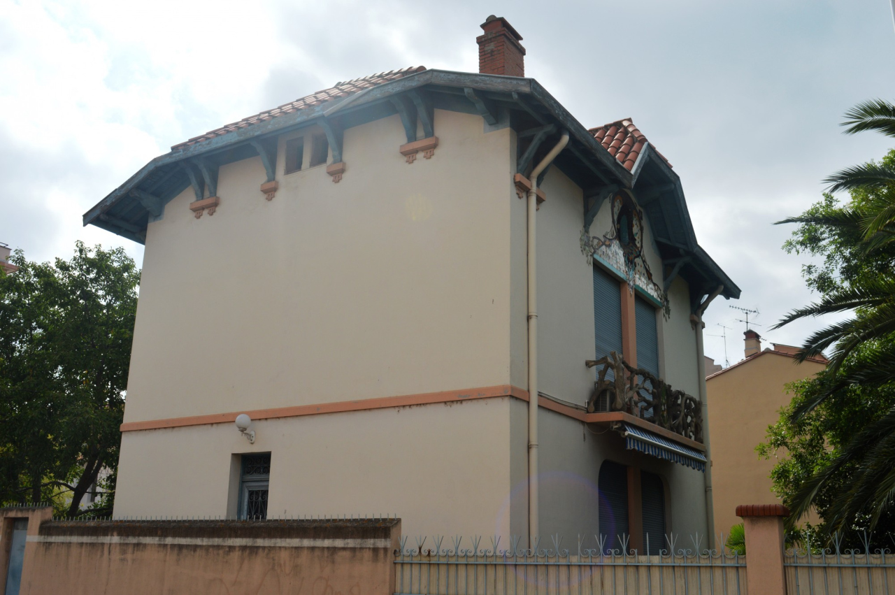 Description : L'habitation comprend un portail en ferronnerie entourant le jardin, des mosaïques décoratives au-dessus de la porte d’entrée principale et un toit en tuiles canal.