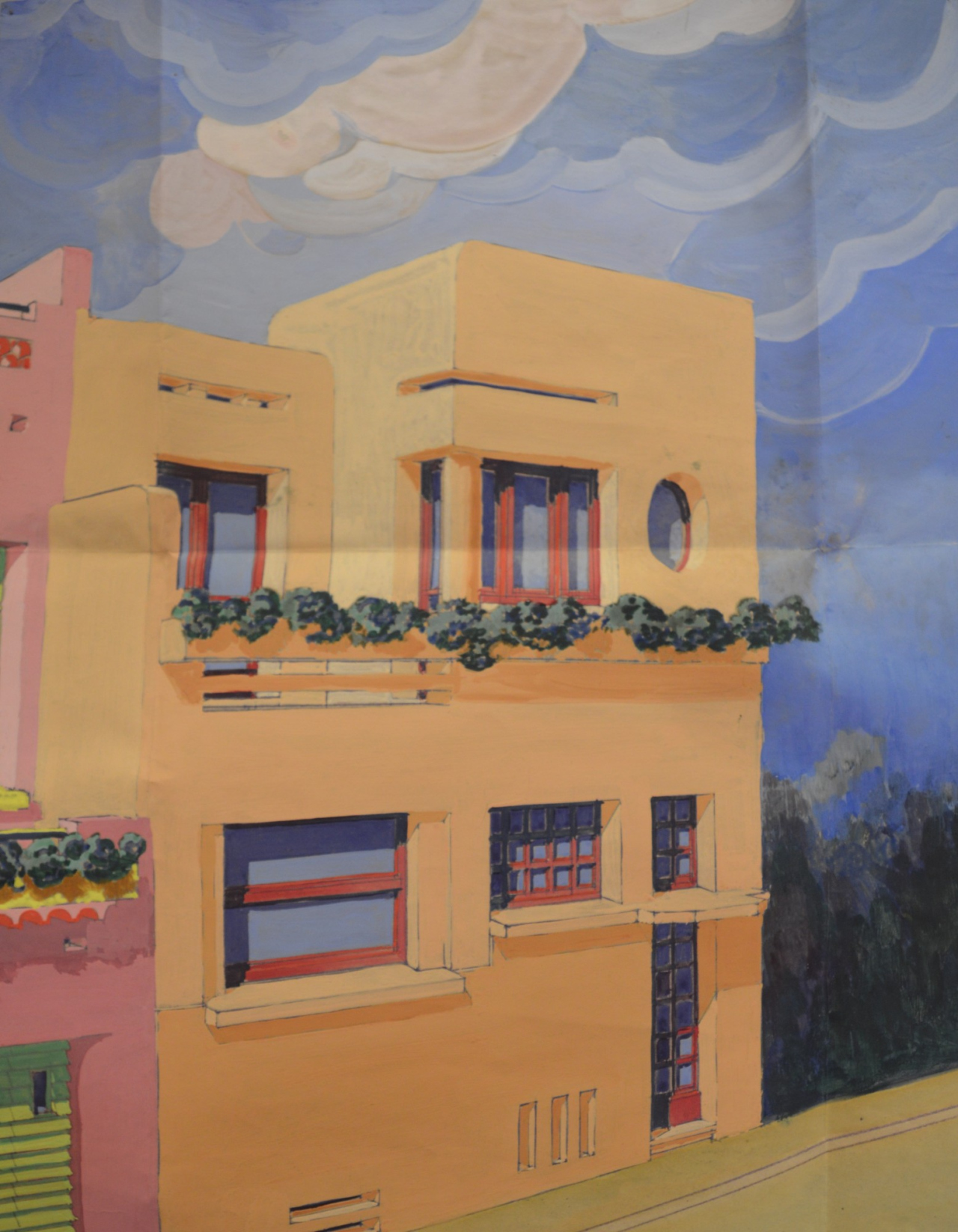 Description : Influence du style Art déco : Balcon avec piliers à l’étage, carreaux décoratifs sur la porte.