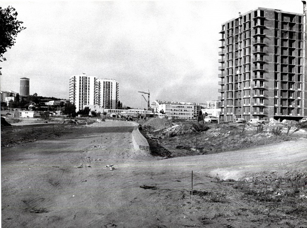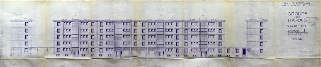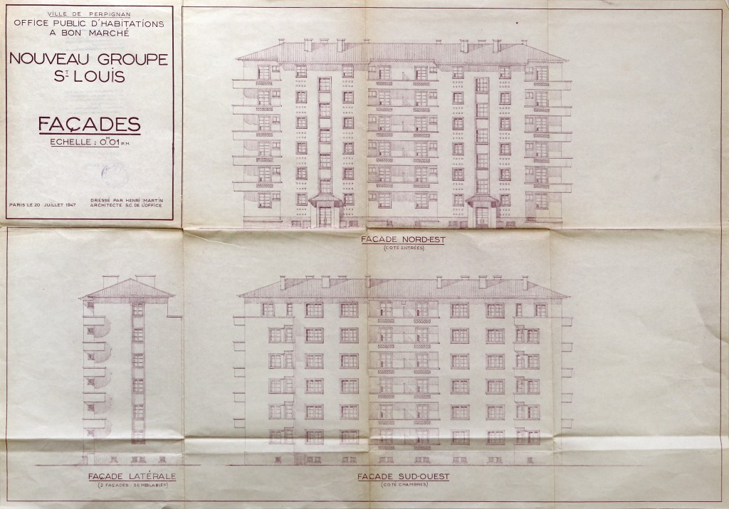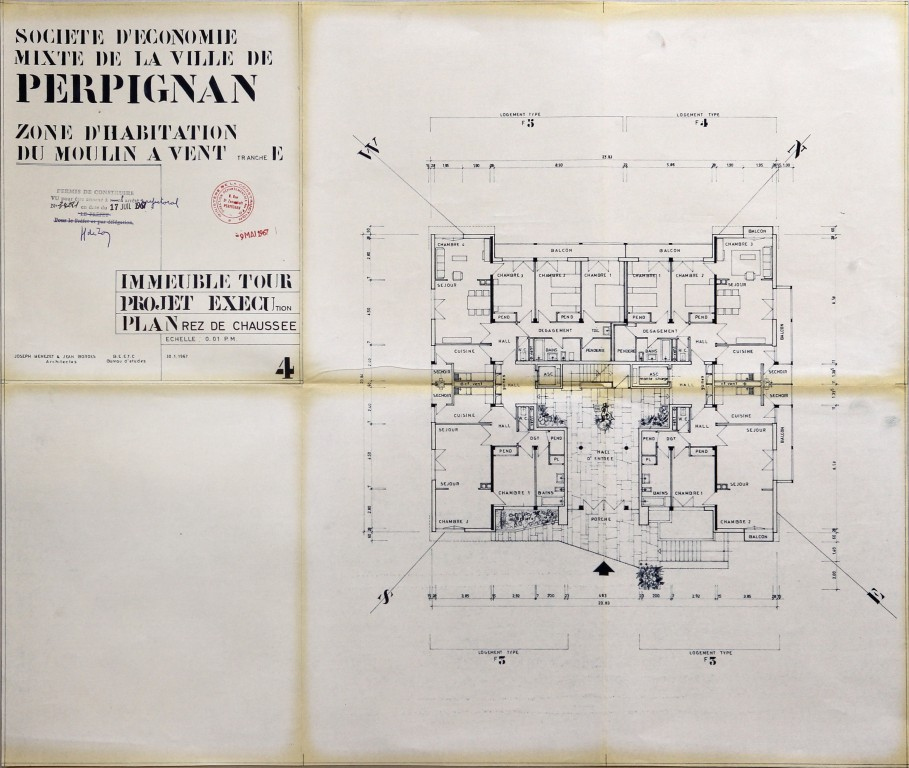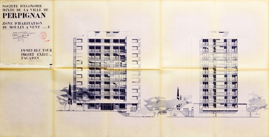 Après 1945, le rythme de développement urbain de Perpignan reprend doucement. La cité, cœur d'une province désindustrialisée, confirmée dans sa vocation agricole et vouée au développement du tourisme balnéaire, reste à l'écart des processus de densification accélérée qui ont transformé les grandes villes françaises. A Perpignan, il y a continuité entre l'avant et l'après-guerre. Dans les quartiers Sud consacrés à l'habitation et au Vernet se poursuit un long processus de construction de basse densité qui donnera comme résultat un bâti homogène et de qualité. Puis, la construction d'une périphérie plus lointaine est envisagée: au Sud, entre les quartiers des maisons de ville si caractéristiques de Perpignan et la banlieue commerciale et résidentielle sans caractère spécifique, se lève le projet urbain le plus ambitieux de la ville : la cité nouvelle du Moulin-à-Vent. Un vaste quartier homogène et souple aux tours et aux résidences fonctionnelles, aux espaces publics ombragés, aux détails d'architecture et aux matériaux évocateurs des traditions régionales.