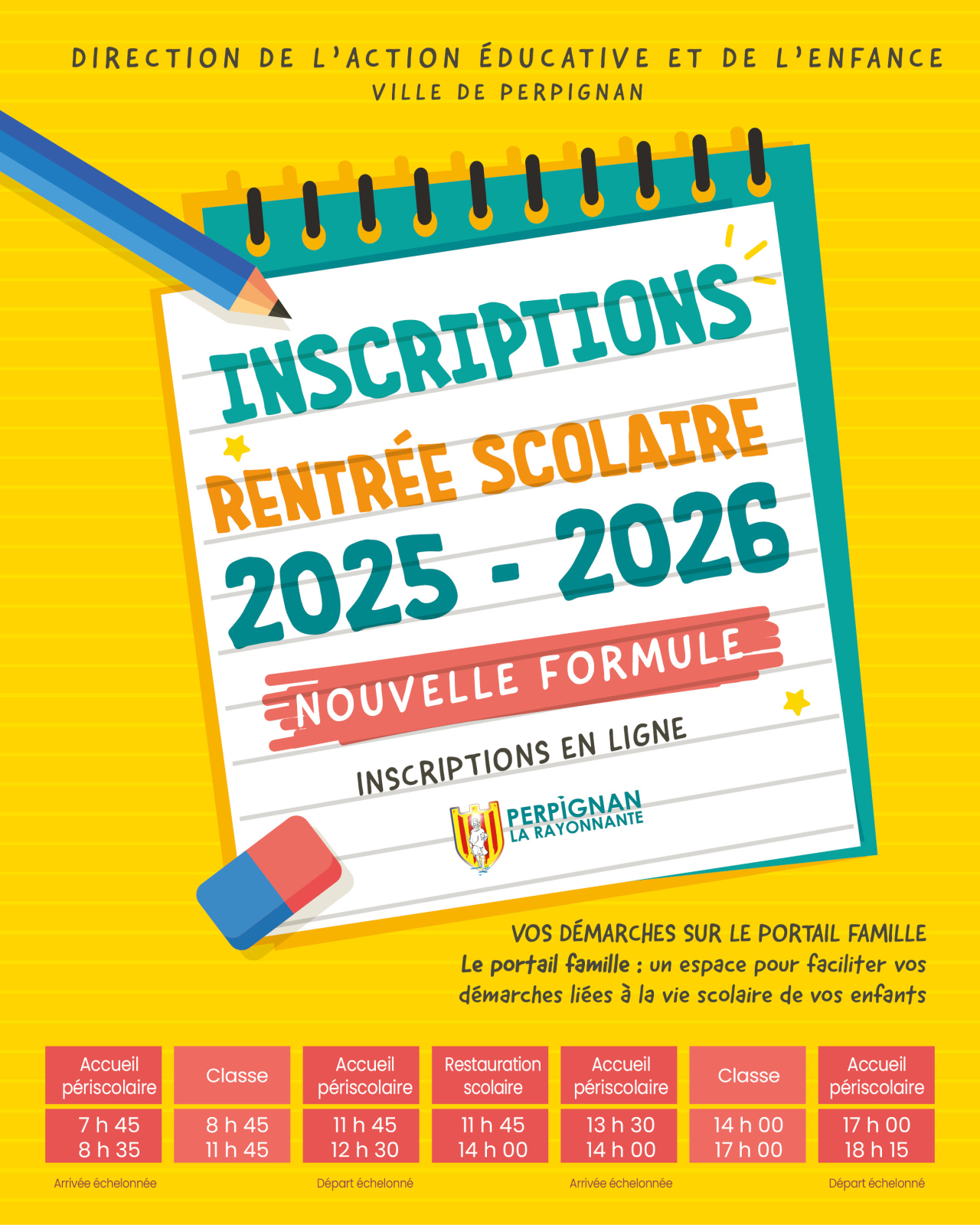À compter du 31 mars 2025, vous pourrez effectuer une inscription scolaire en ligne à l’école de votre périmètre, en 3 étapes sur le portail : https://famille.perpignan.fr