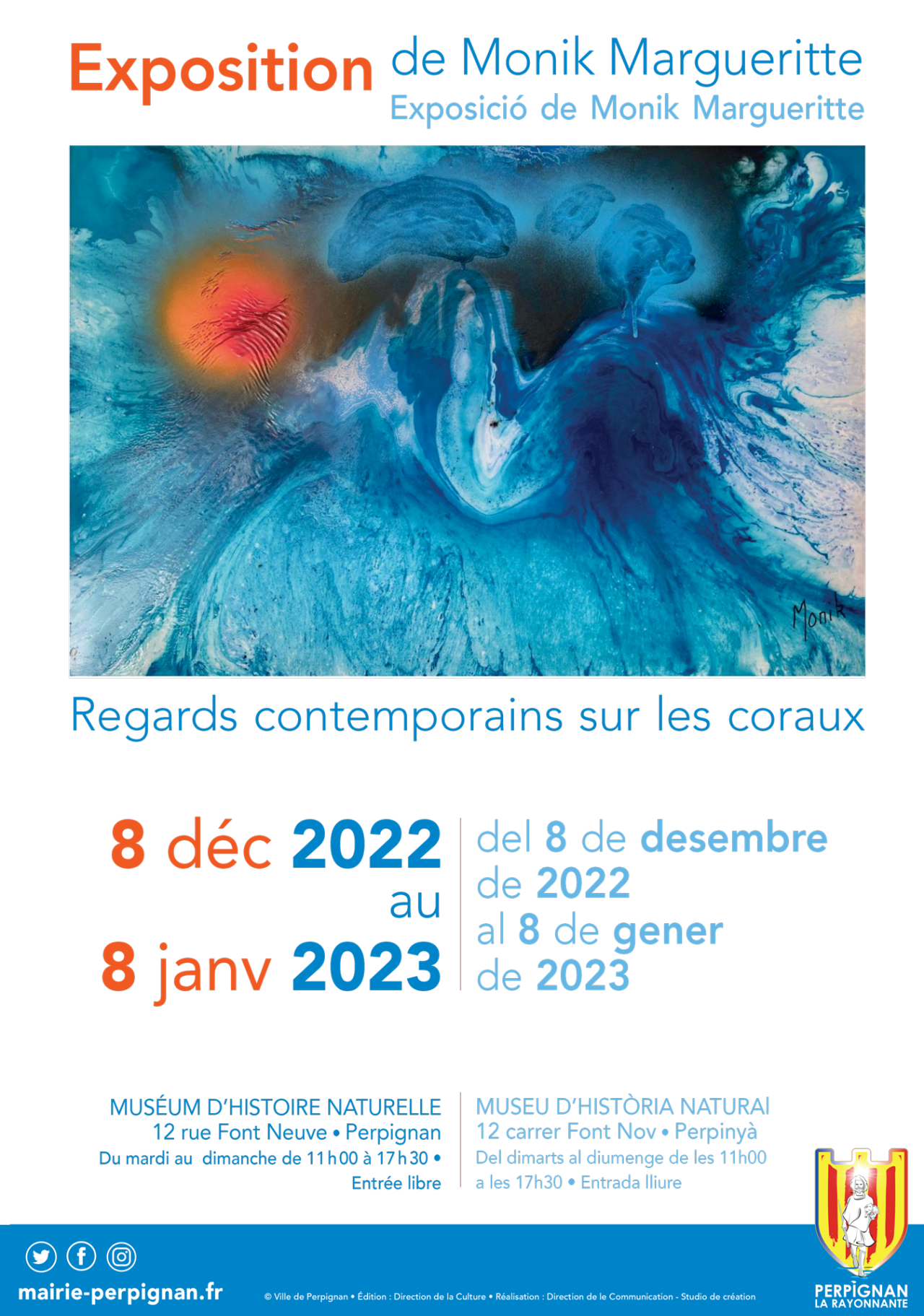 - vernissage de l'exposition de Monik Margueritte intitulée Regards contemporains sur les coraux le jeudi 8 décembre à 19h00 au muséum d'histoire naturelle