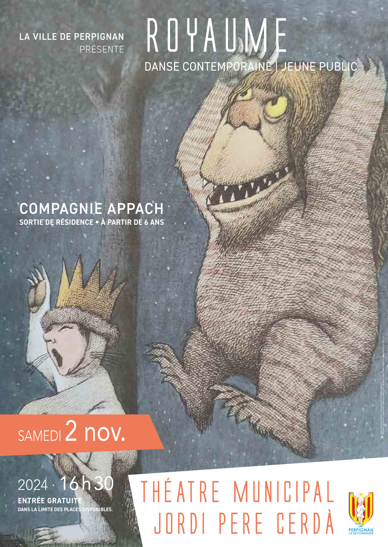 Librement inspiré de l’album jeunesse Max et les Maximonstres de Maurice Sendak, Royaume nous plonge dans le monde intérieur de Max, là où sont les choses sauvages... En duo avec le jeune danseur, Firmin Sancère, Cécile Grassin explore ce qui peut être à l’oeuvre au plus profond de la pensée et de l’imaginaire d’un enfant. La scénographie textile de Sophie Cardin, à la fois grotte, giron et monstre, avale et recrache les deux figures, celle de l’enfant et celle de l’adulte. Les danseurs, supports et entraves l’un pour l’autre, tissent une relation à la fois tendre et animale, où transmission, pouvoir et émancipation sont physiquement mis en jeu. Un univers rock et joyeusement sauvage !